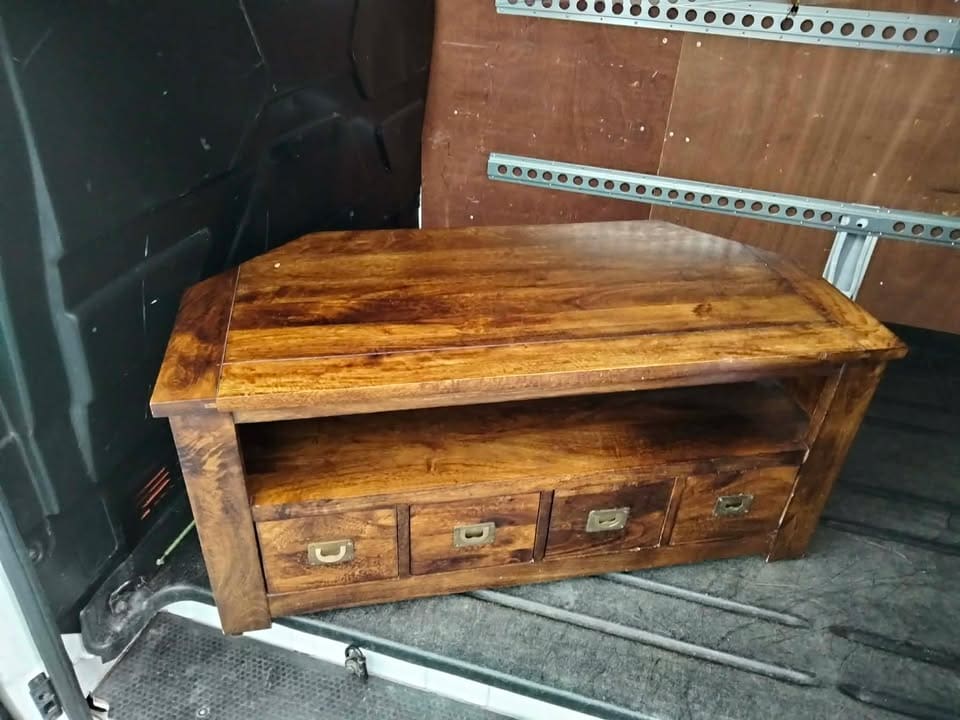 Functionality is key with this unit, which includes a convenient open shelf, ideal for housing media players, soundbars, or gaming consoles. Below this, four spacious drawers provide ample hidden storage for remote controls, cables, DVDs, or other household items, helping to keep your space tidy and organised. Each drawer is fitted with distinctive brass-coloured pull handles, adding a touch of character.