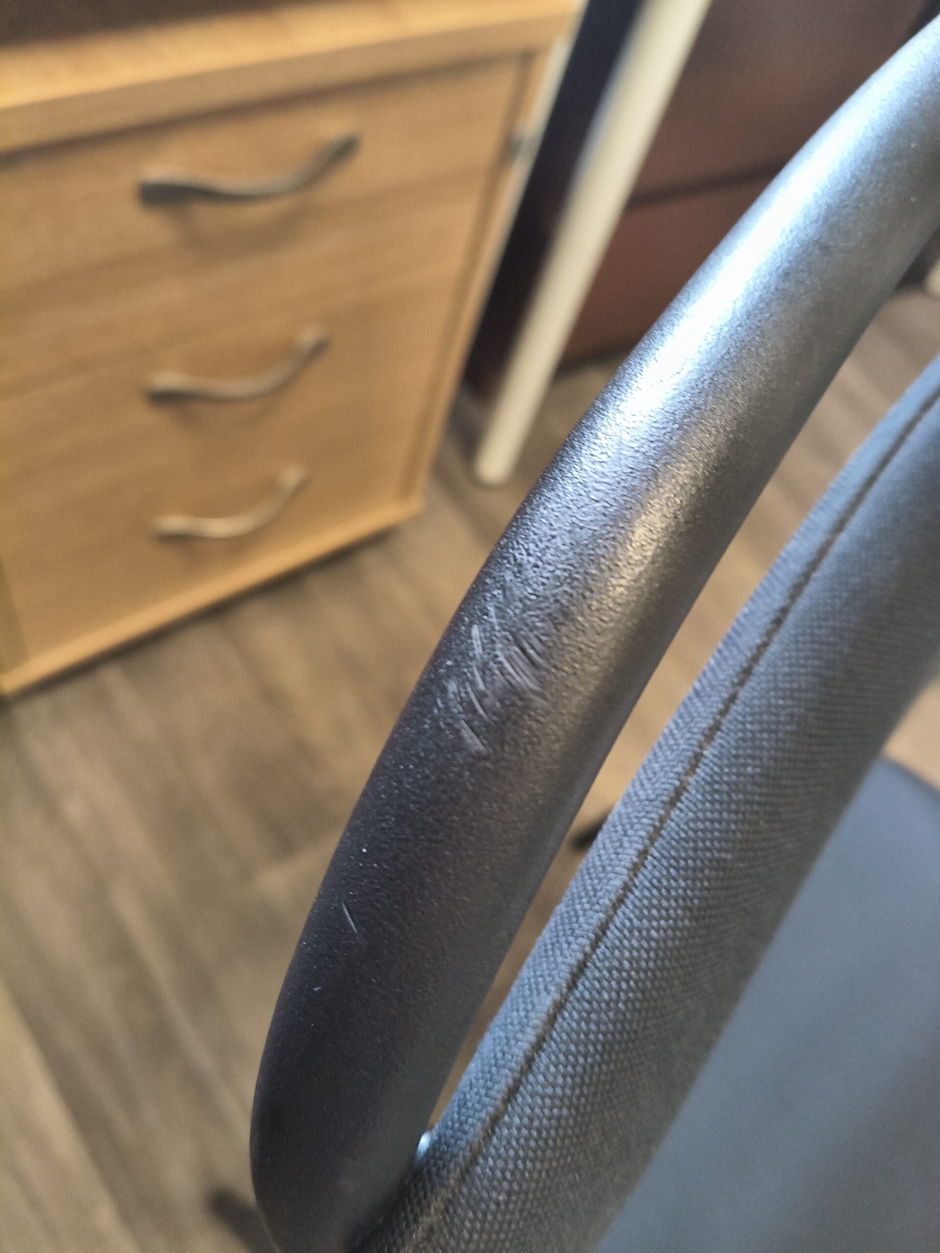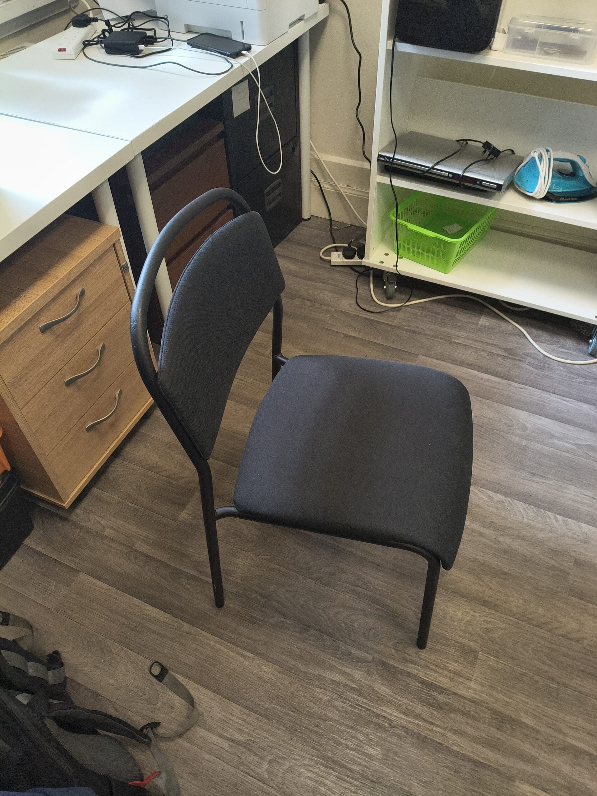 A simple black office chair with a fabric seat and back, supported by a metal frame. This chair is in good condition and would be suitable for an office or home environment. Please note there are some scuffs on the armrest
