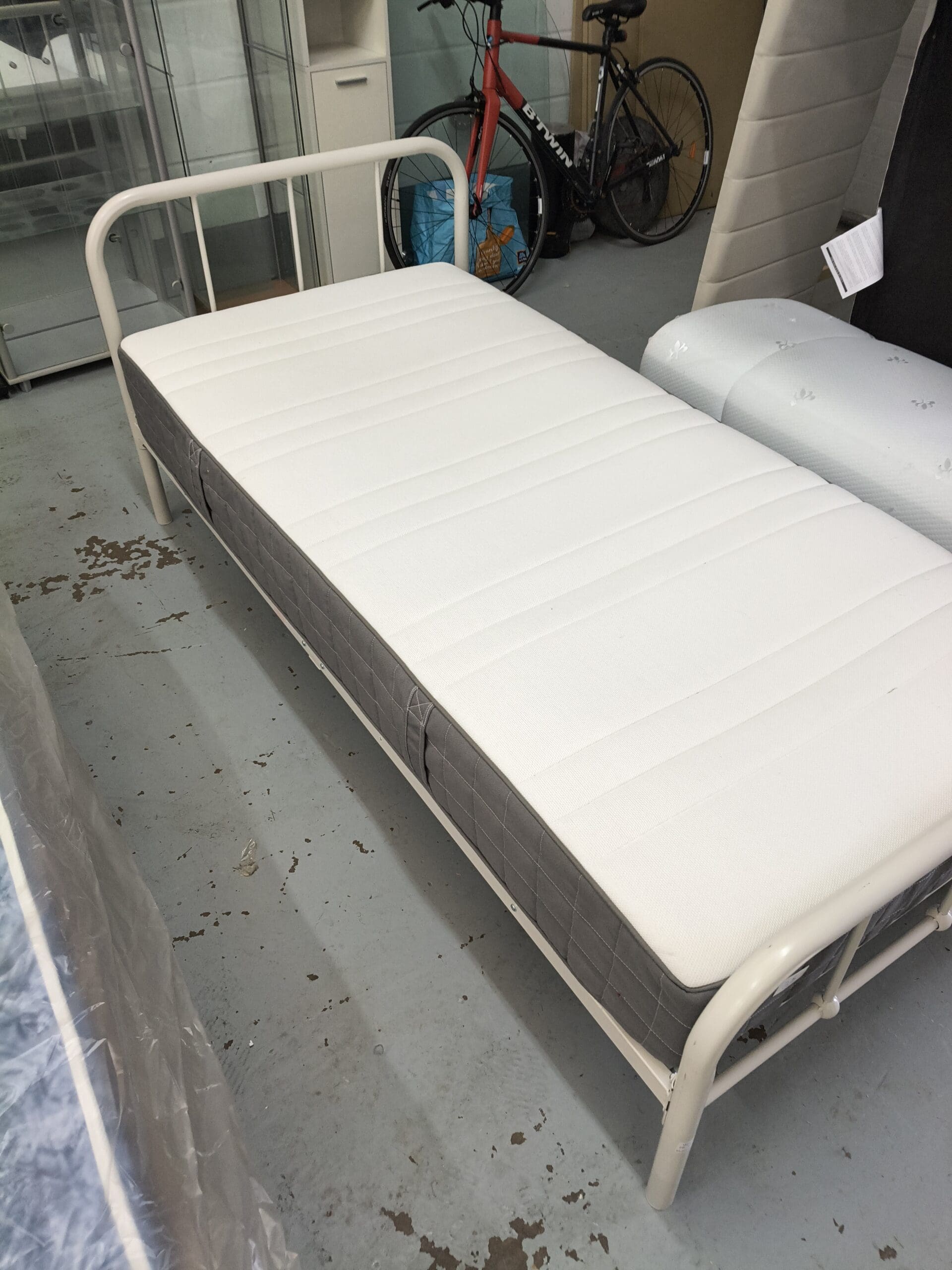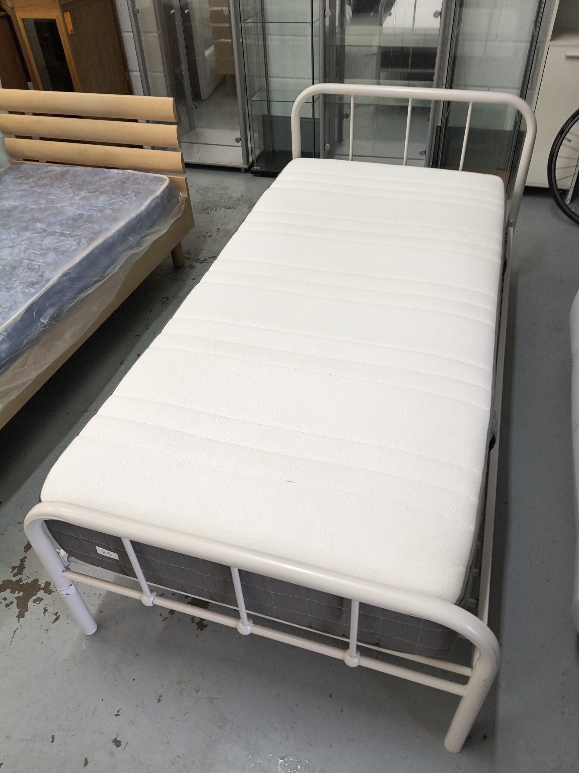 This single bed frame is made from metal with a cream finish. Its straightforward design makes it a versatile option for a child's room, guest room, or a compact living space.