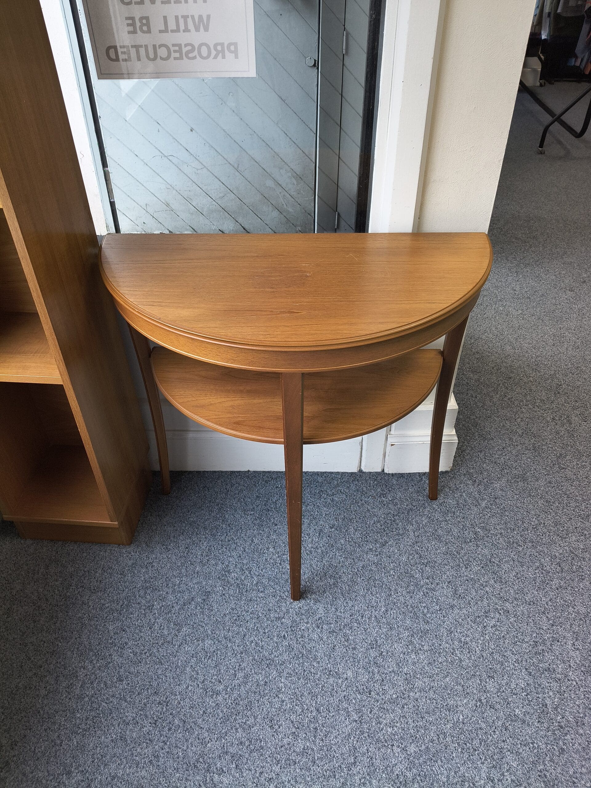 A practical and stylish half circle wooden side table. It features a lower shelf providing additional storage space. This table is in good condition and would be a great addition to a hallway or any small living area
