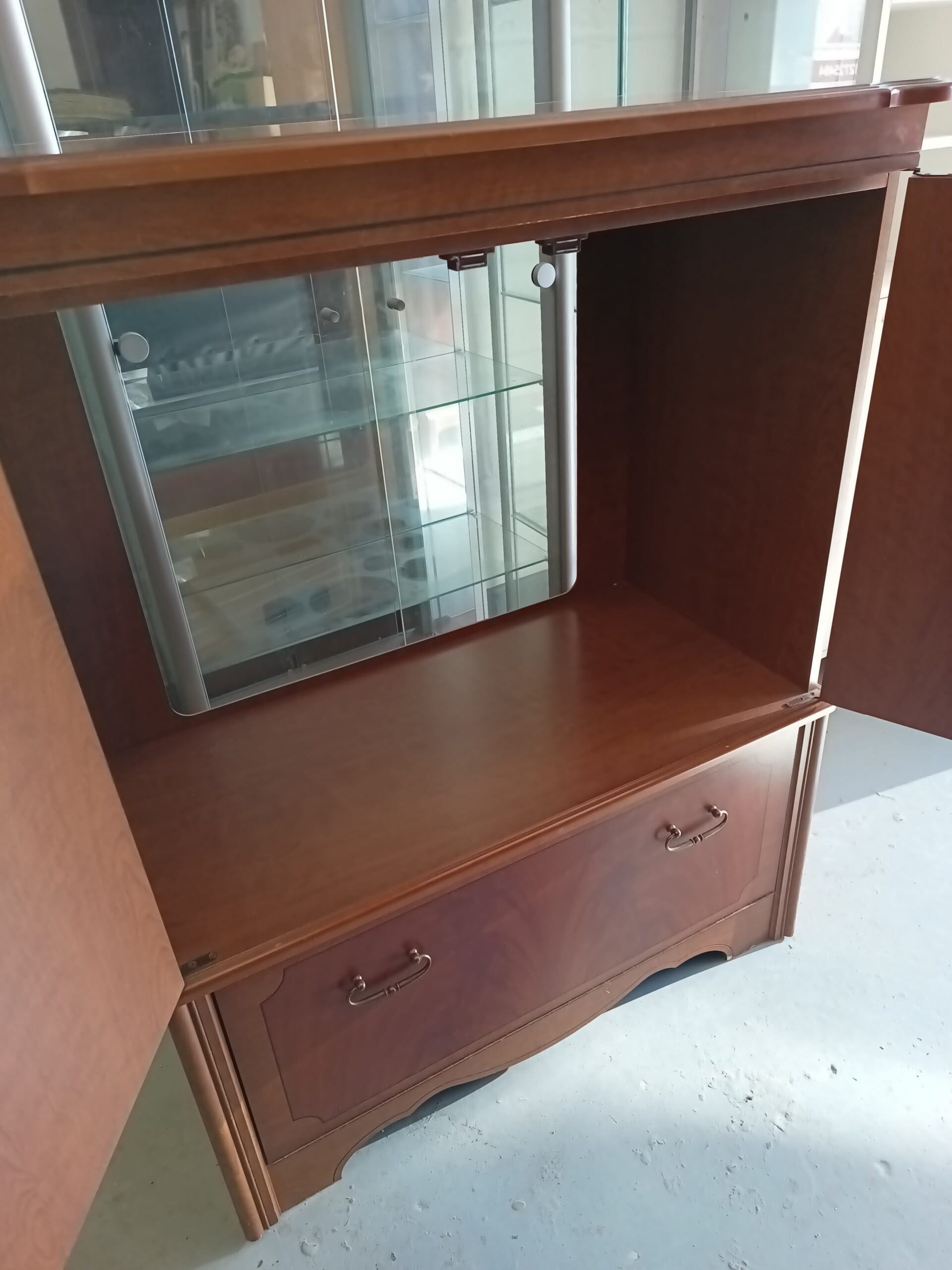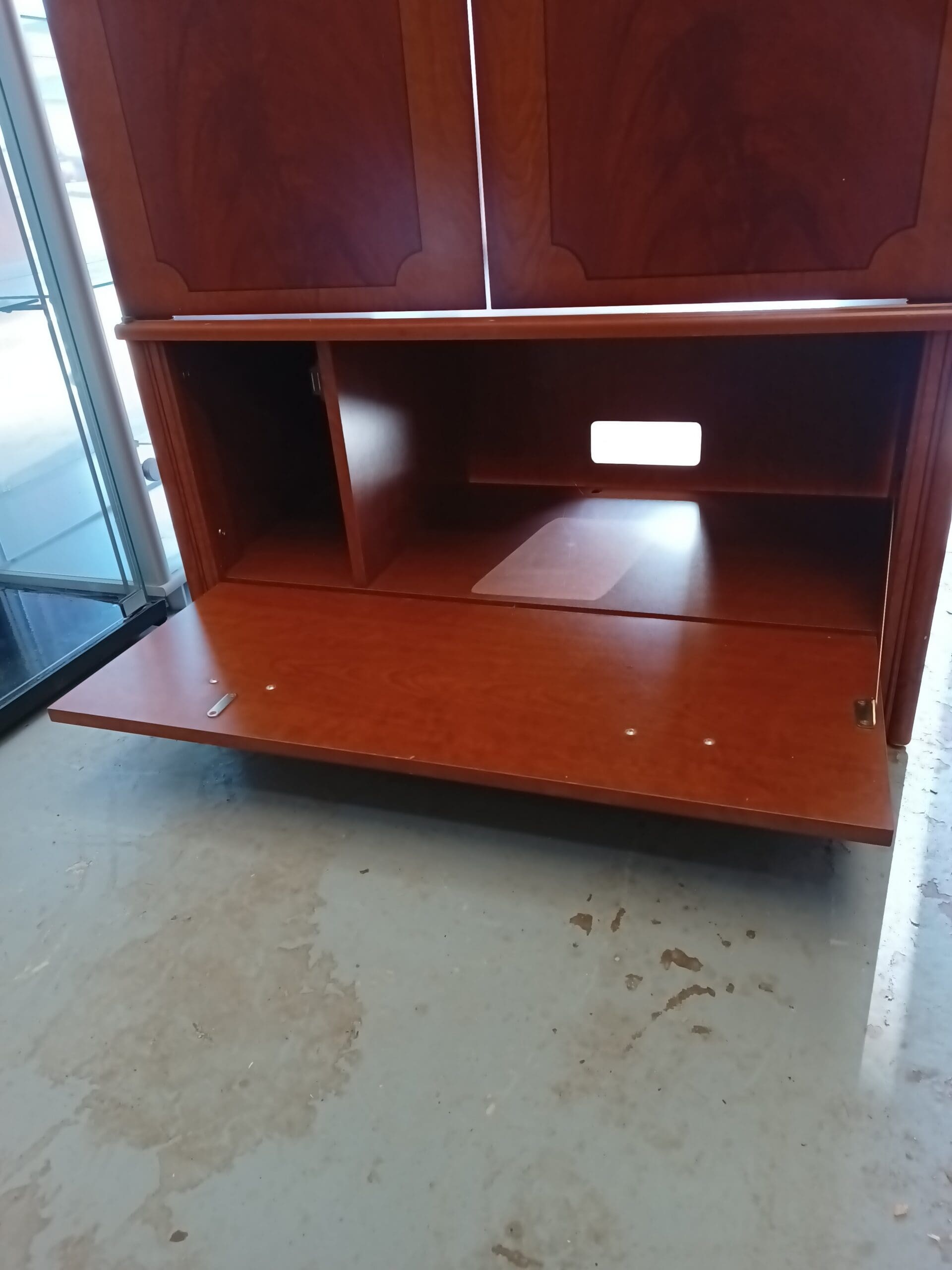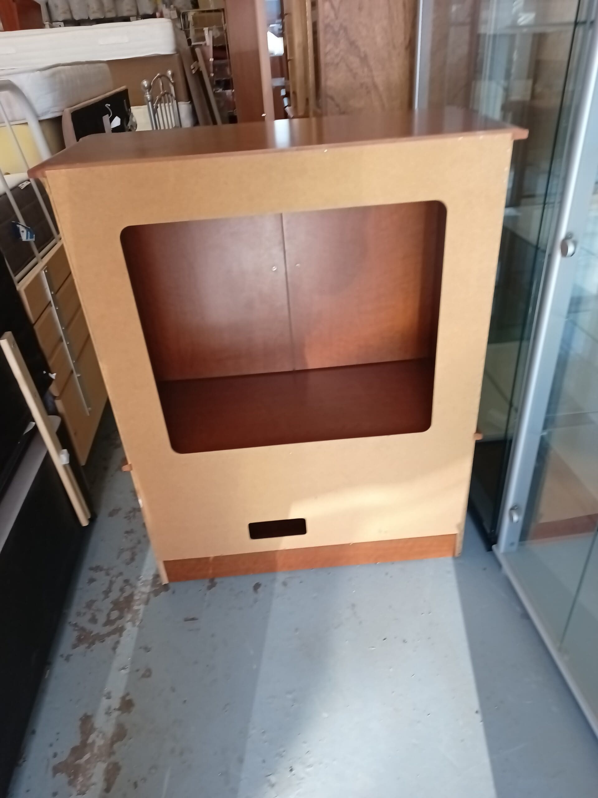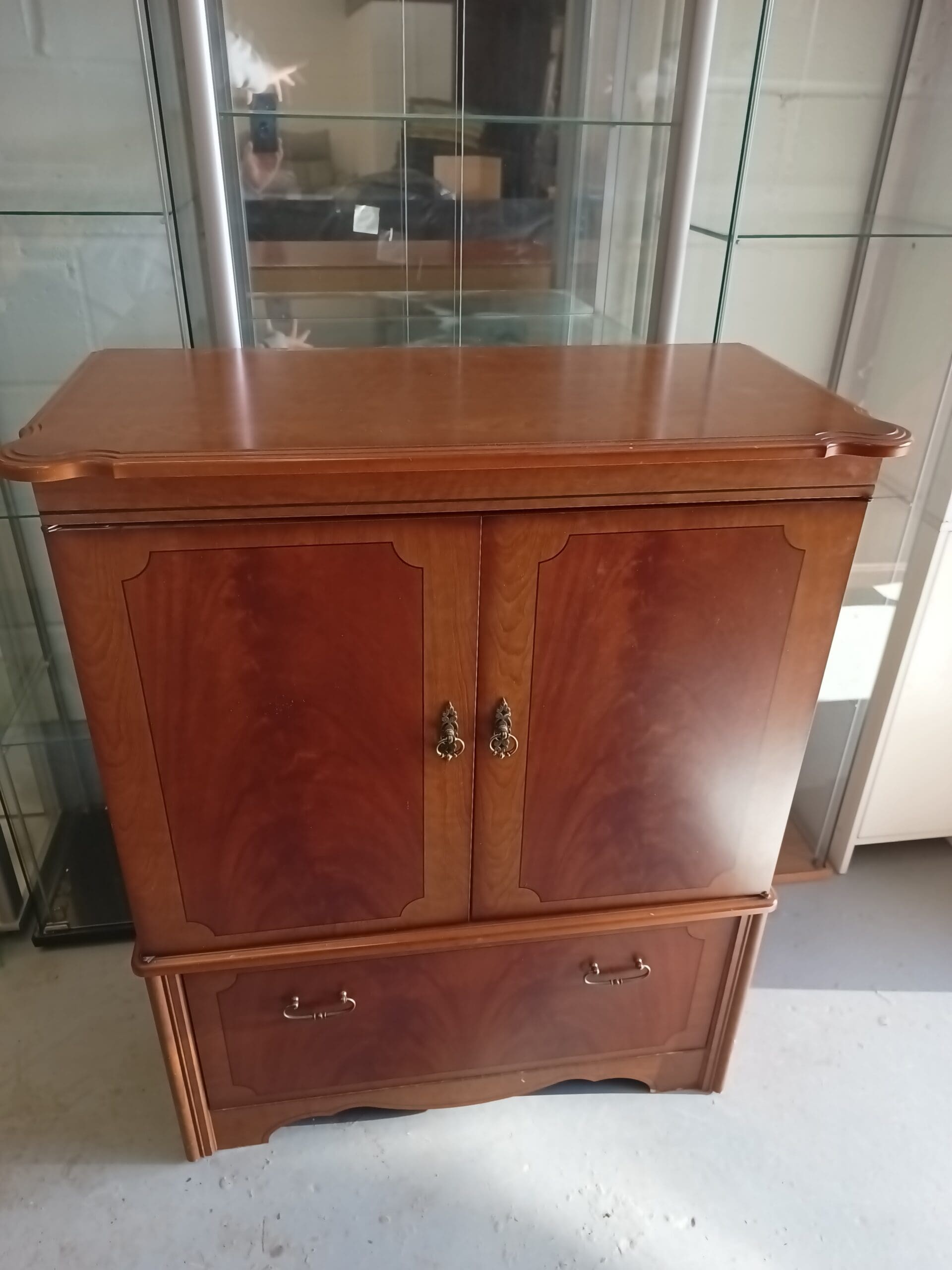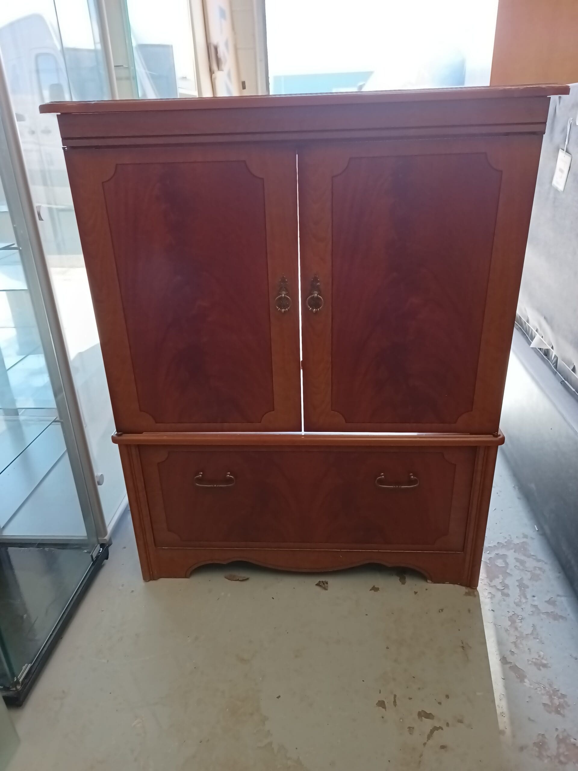 This old-style TV stand offers a classic aesthetic for your living space. It features two cabinet doors that open to reveal storage, and a convenient drawer below. The unit is made of wood and is in excellent condition