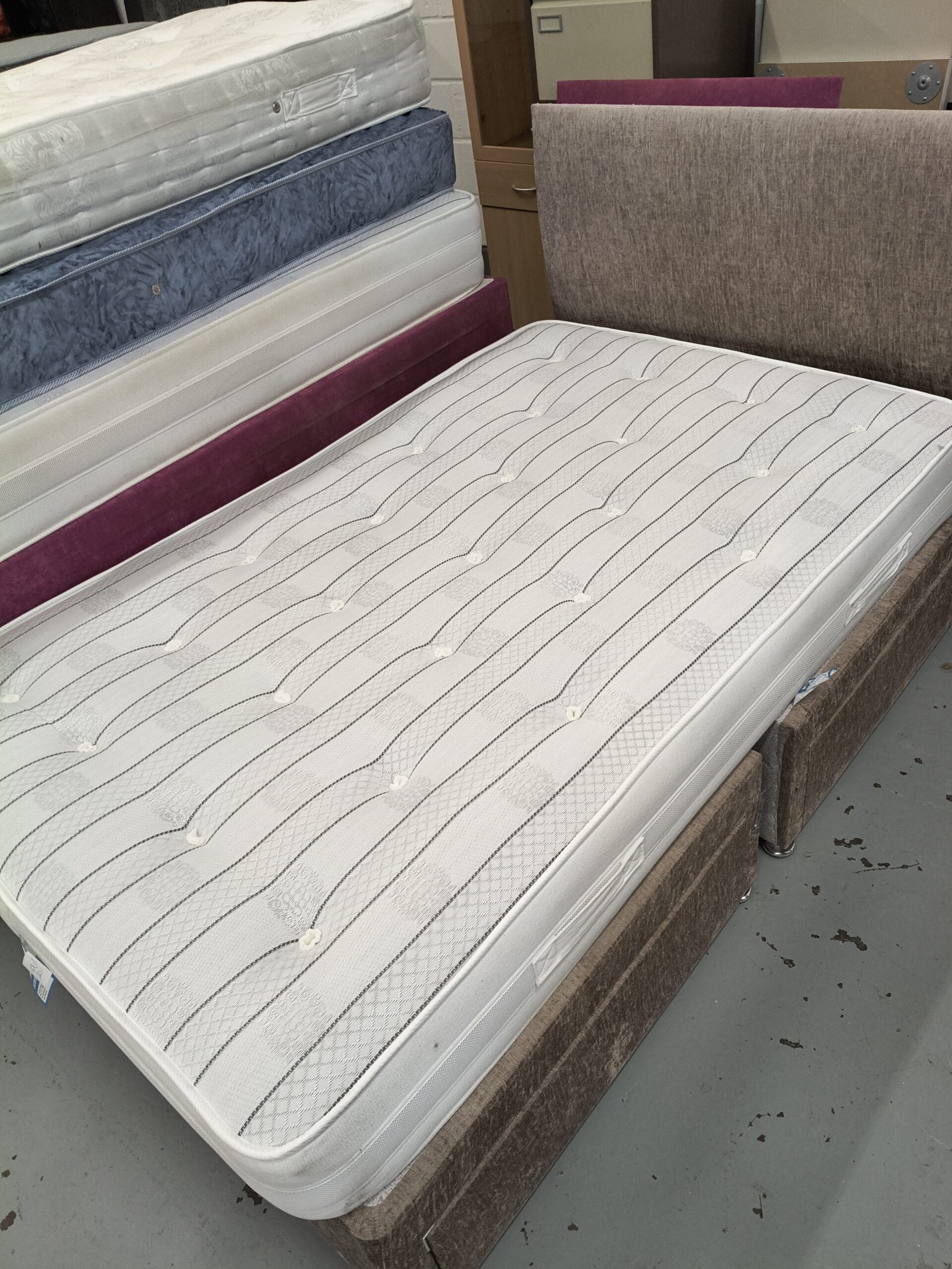 This small double divan bed set includes an upholstered divan base, a mattress, and a matching headboard. The divan base features two practical storage drawers, as seen in the photos. This item is rated in good condition (9/10).