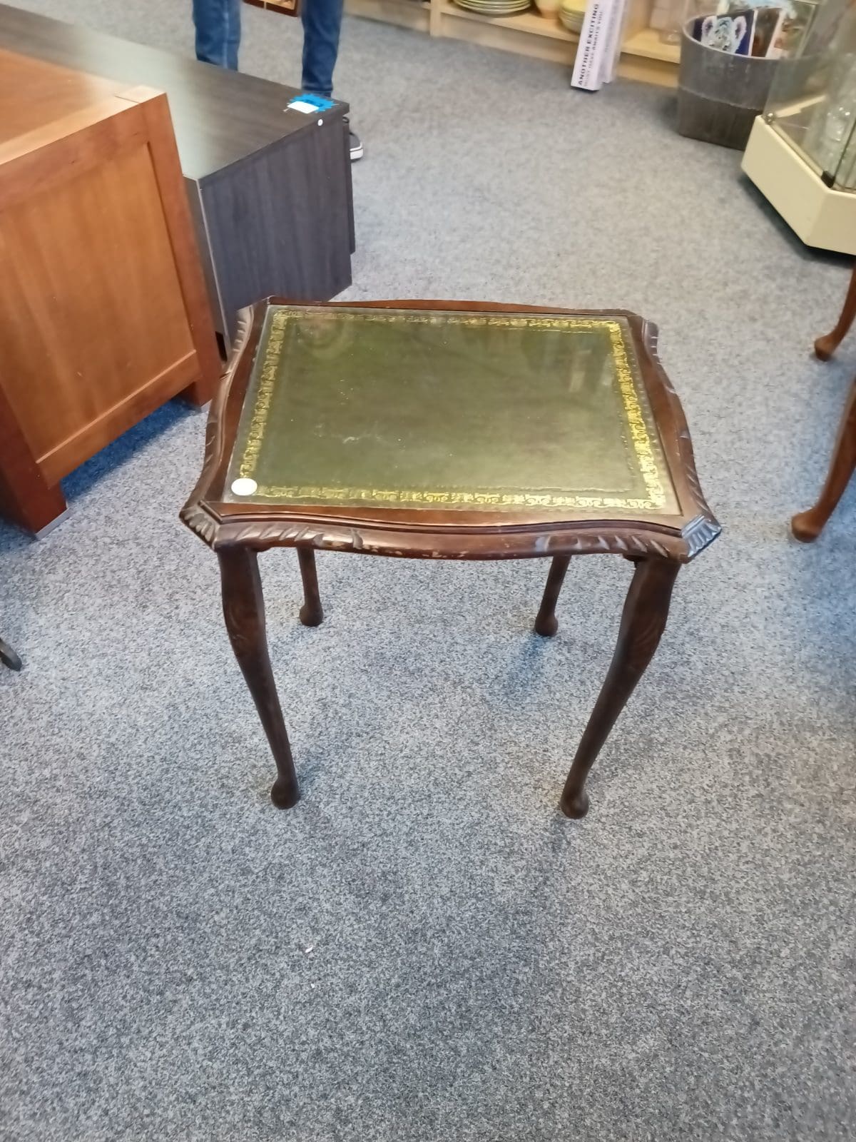 A charming wooden side table featuring a green glass top with a decorative embossed border. The table stands on four carved cabriole legs. It is in good condition and would make a lovely addition to any room as a lamp table or for displaying decorative items